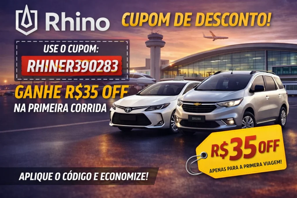 A Rhino trabalha com campanhas, cupons de primeira corrida e ações específicas. Ou seja, o desconto aparece, mas não fica disponível o tempo todo.